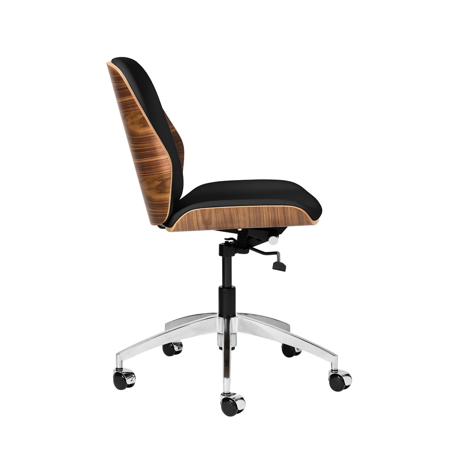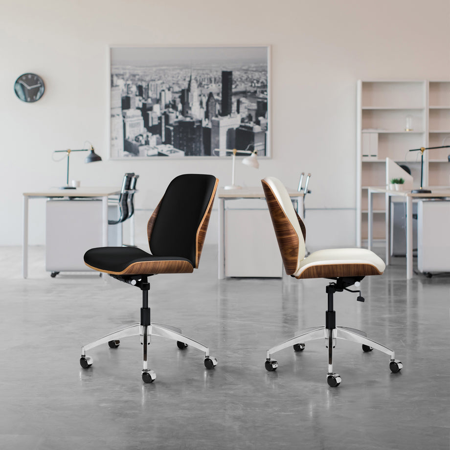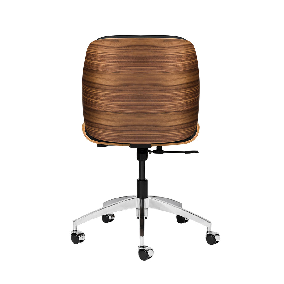 The Rockefeller chair combines the stylings of a mid century modern lounge chair with the simplicity of a functional task chair. The Rockefeller features a firm, yet comfortable seating area wrapped in vegan leather, surrounded by a stunning walnut veneer shell. The Rockefeller functions include a swivel, recline, and height adjustment.