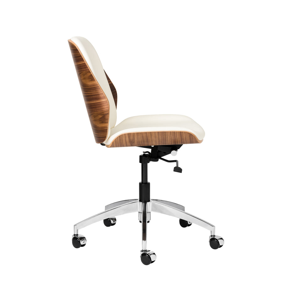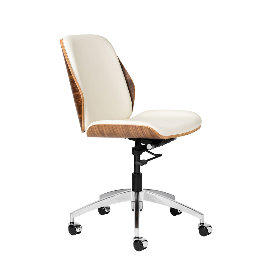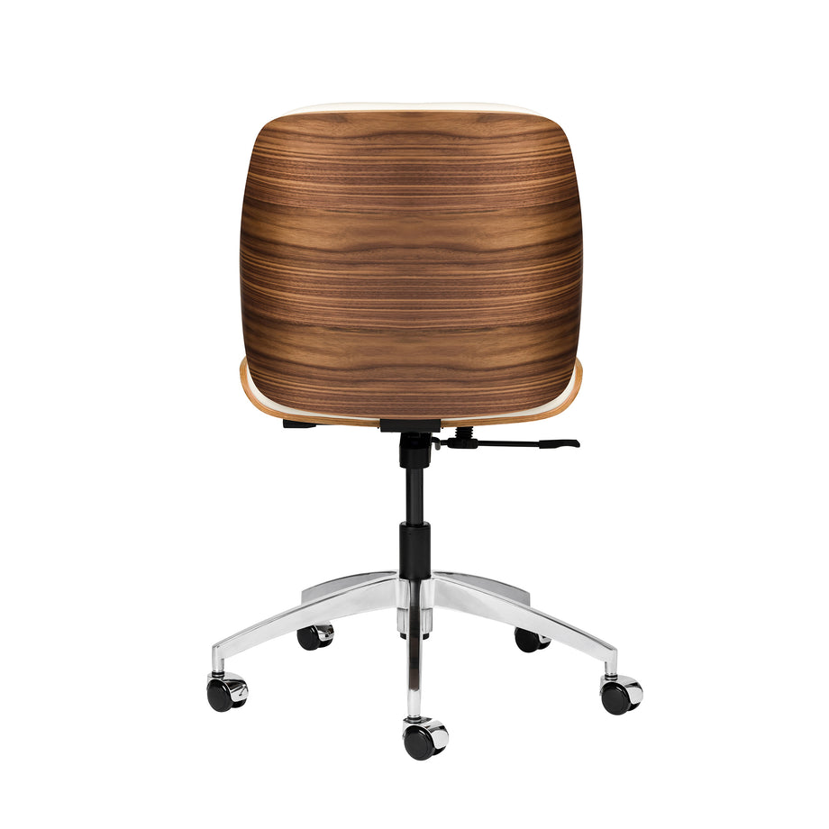 The Rockefeller chair combines the stylings of a mid century modern lounge chair with the simplicity of a functional task chair. The Rockefeller features a firm, yet comfortable seating area wrapped in vegan leather, surrounded by a stunning walnut veneer shell. The Rockefeller functions include a swivel, recline, and height adjustment.
